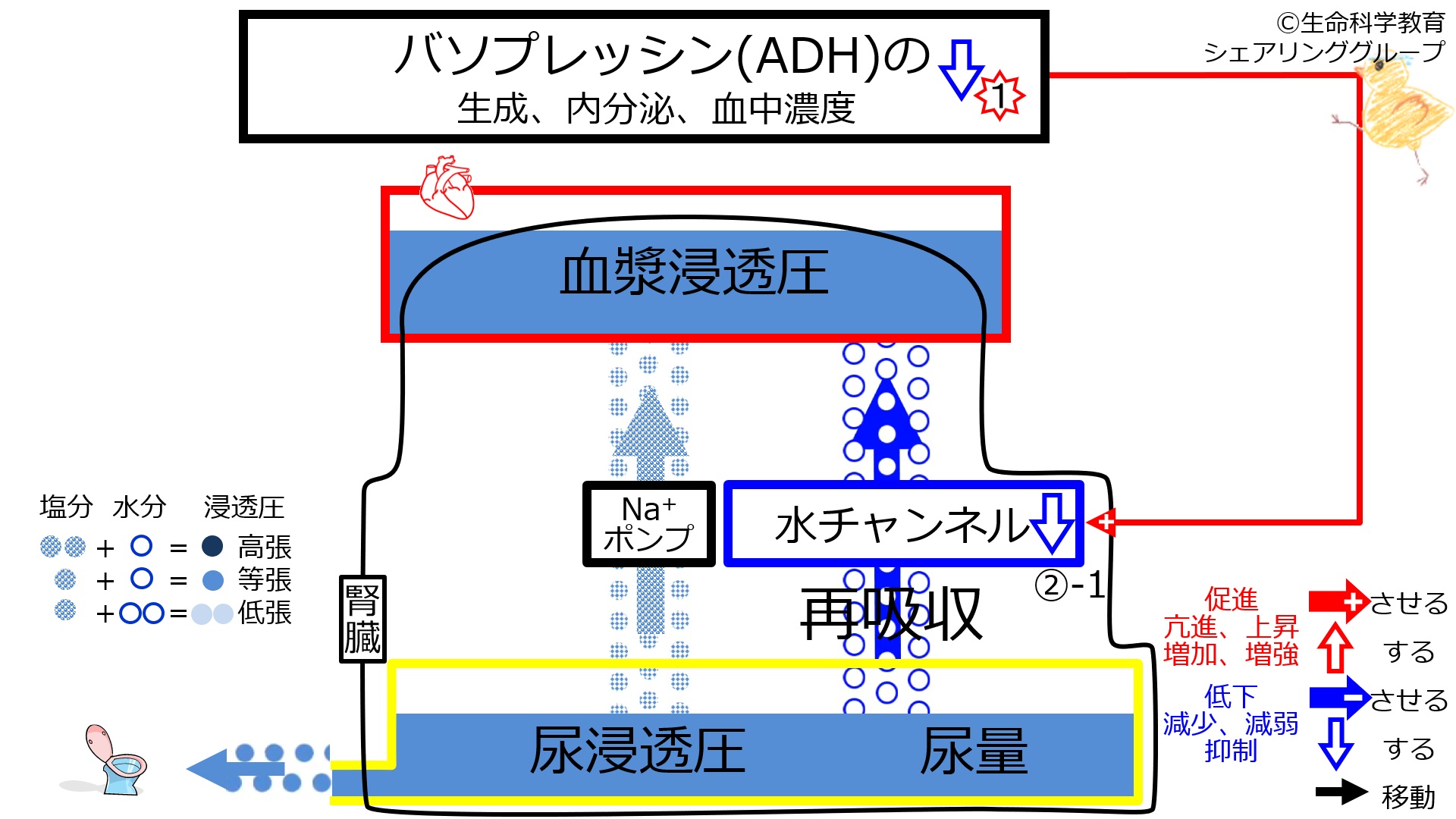 図の①:最初に、バソプレッシン(抗利尿ホルモン ADH)の生成、内分泌、血中濃度が低下したとします。