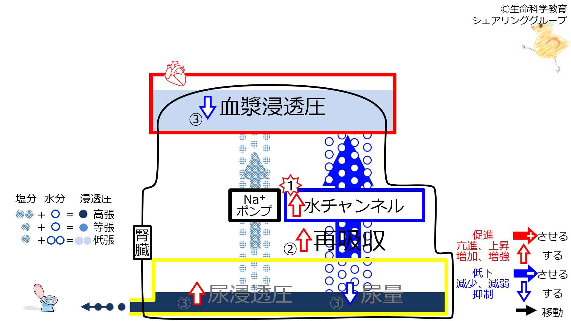 再吸収で(塩分3列、水分4列の)薄い溶液(低張液)が尿細管から出るため、残る液(尿)の浸透圧は上昇し(濃く、高張になり)ます。(尿細管から出る)水分再吸収も増加するため、尿細管に残る水分(尿量)は減少します。つまり尿は濃く、少量になります。