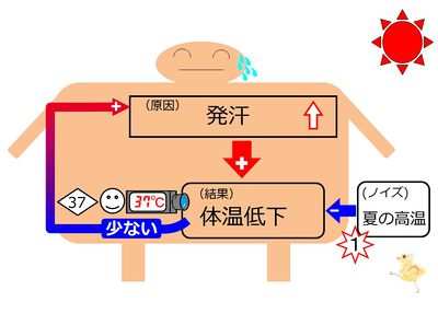 夏の高温では、体温低下という「結果」が少ないため、発汗、すなわち「結果」をもたらす「原因」は増大します。夏の高温などは体温低下を抑制するノイズであり、これに対して、発汗による体温低下の促進作用を多くする調節により、体温のホメオスターシスを保つことができて生理的です。 上り坂でエンジンの回転を増大させるのに似ています。