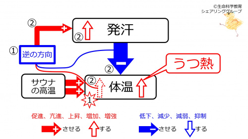 ①サウナに入ったとします。サウナの高温は体温を強く上昇させます。サウナの高温により体温は大きく上昇します。発汗は室温を低下させます。これらは逆の方向(青)です。