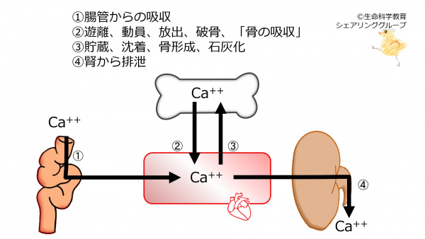 摂取されたカルシウムは、腸管から吸収され、血液<へ>移動します(1)。骨がカルシウムの重要な貯蔵部位であり、血液<から>骨へ移動することを貯蔵、沈着、骨形成、石灰化と言います(3)。骨から血液<へ>の移動は、カルシウムの遊離、動員、放出と呼ばれます。これは、骨を破壊する方向(破骨)の動きです(2)。「骨の吸収」とも呼ばれています。カルシウムは、最終的には血液<から>腎臓へ移動して排泄されます(4)。