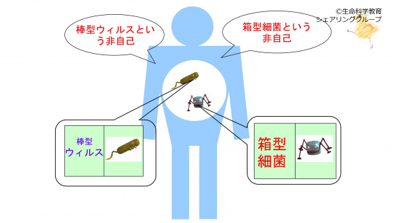 そのため、人体は「箱型細菌という非自己」と「棒型ウィルスという非自己」とを識別することができるのです。