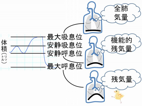以上の三つの体積は、スパイロメータでは測定できません。スパイロメータは、基本的に風船のようなものであり、口鼻での気体の出入りは計測できます。しかし、上記は肺内の気体量であり、 口鼻での気体の出入りではありませんから、スパイロメータでは測定できないのです。