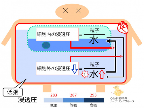 細胞外の溶液の水分量が増加し、浸透圧が細胞内よりも細胞外で低い場合、その細胞外の溶液は「低張」です。極端な例が真水です。真水の中でヒトの細胞は生存できません。