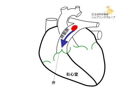 右心室と肺動脈との間にある弁は、右心室から肺動脈へは、弁が開いて、血液を流します。