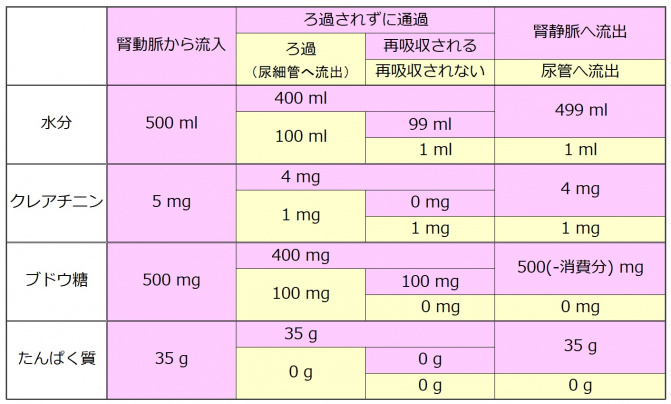 毎分、腎動脈から、血漿中の水分が約500 ml流入しています。その中にブドウ糖が約500 mg、クレアチニンが約5 mg溶けています。100 mlの中には、ブドウ糖約100 mg、クレアチニン約1 mgが入っています。