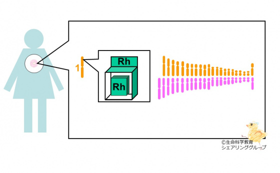 1番染色体にRh遺伝子の座(ざ)(緑色の箱)があり、Rh遺伝子はそこに入っているのです。