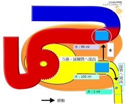 糸球体でろ過され、尿細管へ流出した約100 mLの水のうち、約99 mLが尿細管周囲毛細血管へ移動します。