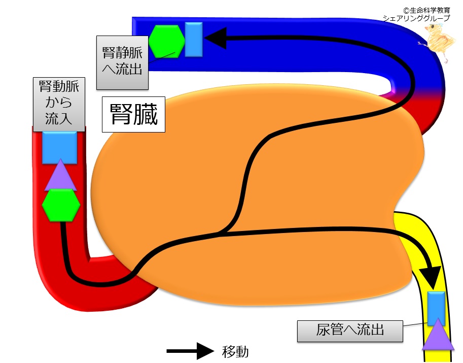 腎臓には腎動脈から血液が流入します。出口は腎静脈と尿管です。 血液中の物質によってどちらの出口に行くかが違います。 *腎動脈から流入した全てが腎静脈へ流出する物質 *流入した全部が尿管へ流出する物質 *腎静脈、尿管の両方に流出する物質 の3通りがあります。