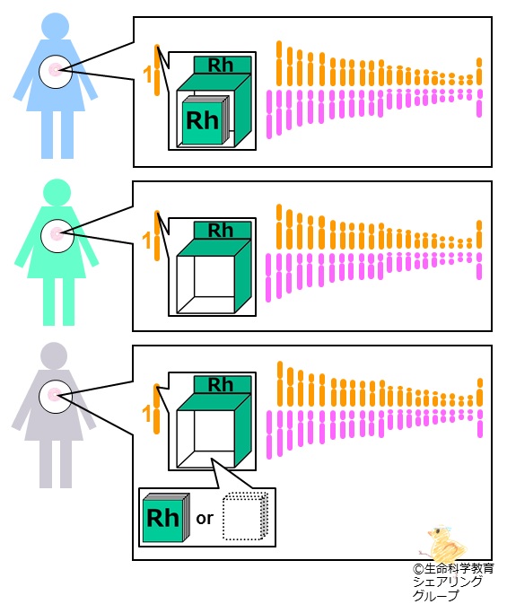 1番染色体にあるRh遺伝子の座に、Rh遺伝子が必ず入っているわけではありません。人によっては、Rh遺伝子の座に、Rh遺伝子が入っていないこともあるのです。