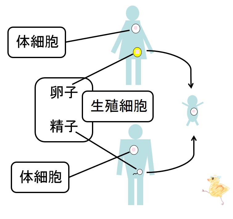 | 細胞には、遺伝子を次世代に伝える(赤ちゃんを作る)ための生殖細胞と、遺伝子の情報を使って働く体細胞とがある。 |
