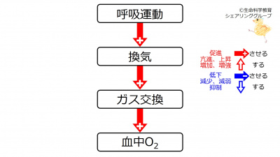 呼吸運動の低下は換気を低下させます。 換気の低下はガス交換を低下させます。 ガス交換が低下すると血中O2増加作用が減弱し血中O2が減少します。