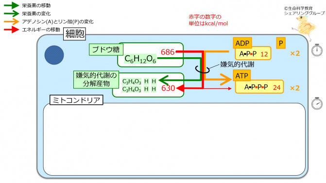 1モルのグルコース(ブドウ糖)には、約686 kcalのエネルギーがあります。最初の代謝は、酸素を使わないエネルギー代謝(嫌気的代謝)である解糖系です。嫌気的代謝は効率が低く、(ピルビン酸など)分解産物全体には約630 kcalものエネルギーが残っています。取り出されたエネルギーでATPが生成されます。アデノシン二リン酸(ADP)とアデノシン三リン酸(ATP)とのエネルギー差は12kcal/molです。1モルのグルコース(ブドウ糖)の嫌気的代謝ではATPは2モルしか生成されません。解糖系はミトコンドリアの外で行われています。