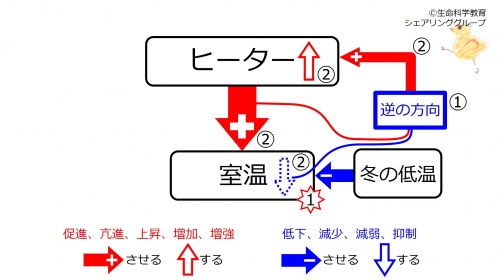 ② これらは逆の方向(青)なので、負のフィードバックはヒーター(の機能)を(電源をつけるなどして)亢進(赤)させます。この調節により、ヒーターの室温上昇作用が増強し、低下していた室温は(冬の前の室温へ向けて)上昇します。