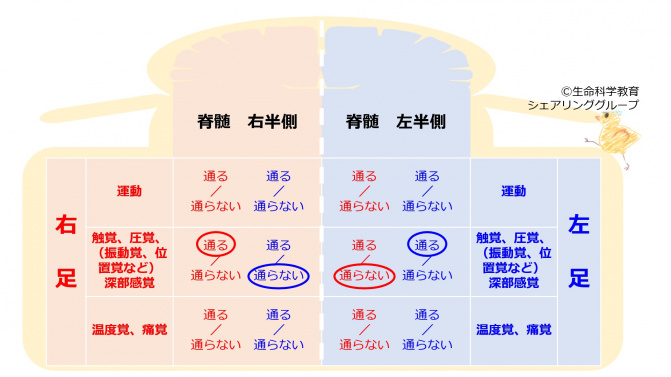 左足からの「振動されている」信号の伝導路は、 脳 脊髄神経 正解!レベルで左右の正中線を交叉するため、脊髄の 右半側は通らずに左半側を通り 左半側は通らずに右半側を通り 正解!、右脳に届く。