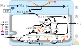 解糖系からのATPも、クレブス回路からのATPも、ATP合成酵素からのATPも同様に活発に生成されて、増加を示す上向きの矢印があります。