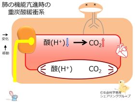 | CO2の減少に対して重炭酸緩衝系が作用すると、H+が減少する。 |