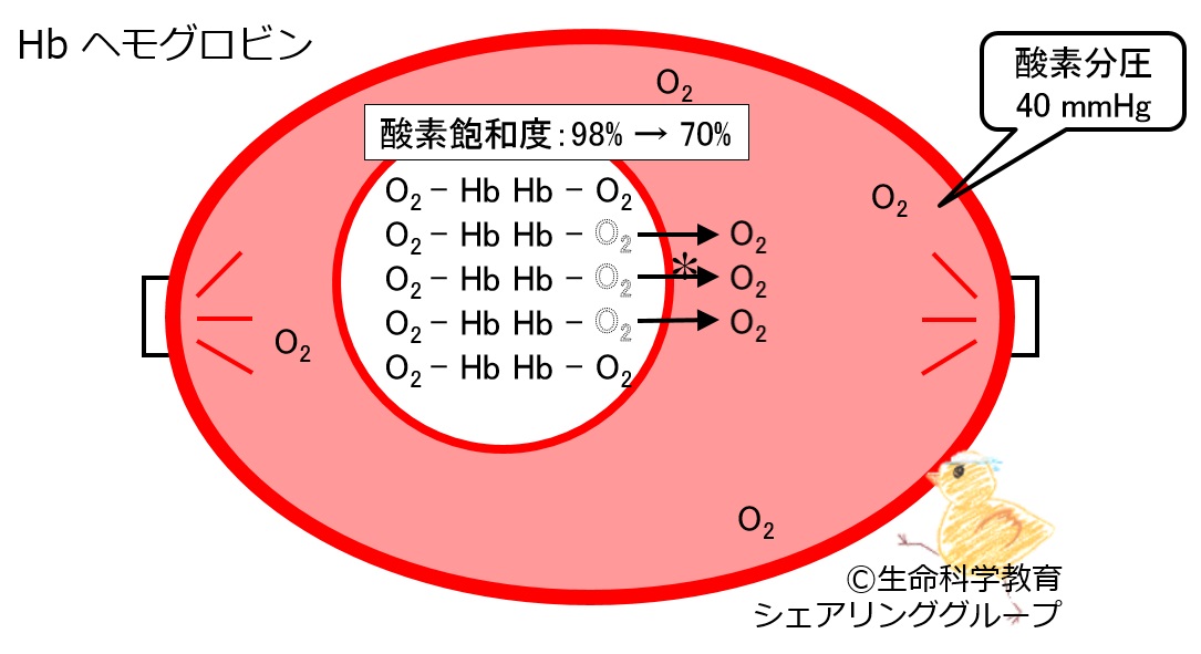 図の説明:末梢の酸素分圧は低く(O2が4コある)、酸素は赤血球内のヘモグロビンから筋組織の(矢印の)方向へ移動します。