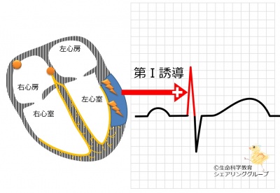 第I誘導のR波は、主に、左心室側壁が脱分極(収縮開始)している際の電気により出現します。そのため、左心室側壁が厚いと、第I誘導のR波も高いのです。