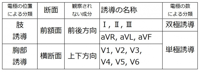 | 双極誘導では、取り付けた2つの電極を結ぶ線が誘導の方向となる。単極誘導では、取り付けた電極と心臓の電気的中心とを結ぶ線が誘導の方向となる。 |
