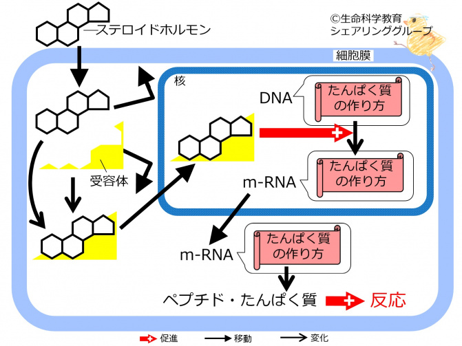 ステロイドホルモンは細胞膜を通過し、ステロイドホルモンの受容体は細胞質にあります。ステロイドホルモン-受容体結合体は核の中に入り、DNA情報のmRNAへの転写を促進します。mRNAは核外でペプチド、タンパク質生成に必要な情報を提供し、生成したペプチド、タンパク質が生理活性をもたらします。