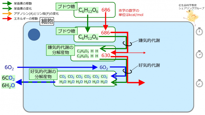 栄養素は最初、酸素を使わないエネルギー代謝を受けます。これを嫌気的代謝と呼びます。酸素を使わない場合、エネルギー代謝の効率は低く嫌気的代謝の代謝産物にはまだ多くのエネルギーが残っています。 次に、この代謝産物は酸素を使ったエネルギー代謝を受けます。これを好気的代謝といいます。酸素を使ったエネルギー代謝は効率が高く、分解産物は二酸化炭素と水です。 赤い数字は、それぞれの物質内の化学的エネルギー量(単位はkcal/mol)です。