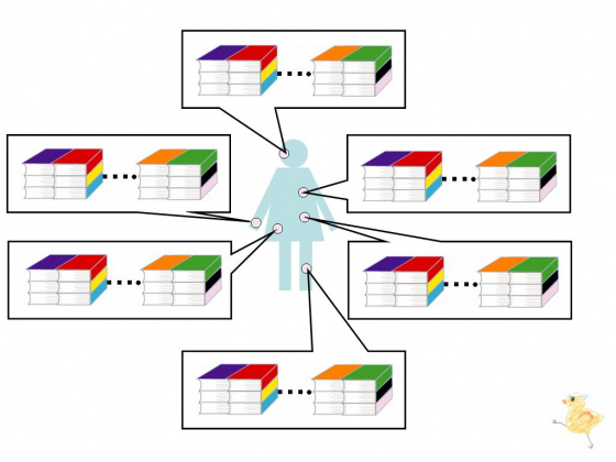 遺伝子(図中の本)は、細胞の中にあります。また、ある体細胞の中にあるのは、その細胞が使っている遺伝子だけではなく、使っていない遺伝子も含め、すべての遺伝子です。他のすべての体細胞にも同様に、すべての遺伝子が入っています。