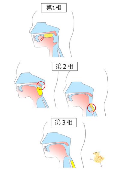 嚥下の第一相では、 口唇が閉じられ、舌で食塊が後方に押しやられる 咽頭と口腔、鼻腔、気道とはそれぞれ舌、軟口蓋、喉頭蓋で通路が閉じられる 食道の蠕動によって、食塊は胃へ移動する 。