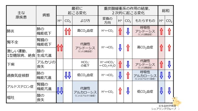 肺の機能亢進(過換気症候群) 腎臓の機能亢進(アルドステロン症) 肺の機能低下(肺炎) 腎臓の機能低下(腎不全) 激しい運動 糖尿病 絶食 嘔吐 下痢 により、呼吸性アシドーシス(による酸血症)がもたらされる。