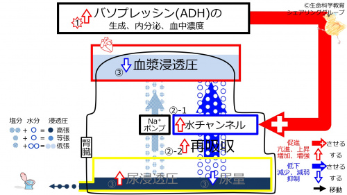 ②-1(図):バソプレッシン、抗利尿ホルモン(ADH)の水チャンネル増加作用が増強し、水チャンネルは増加します。