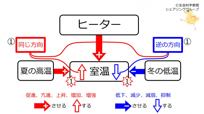 室温が上昇/低下した時、負のフィードバックはヒーター(の機能)を低下/亢進させる。これにより、最初の変化(室温の上昇/低下)は小さくなる。
