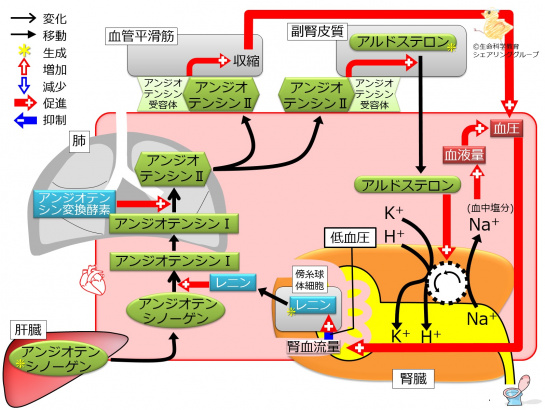 出血は血圧上昇の抑制要因であり、これに対して、レニンの生成、内分泌による血圧上昇の促進を多くする調節により、血圧のホメオスターシスを保っているわけです。