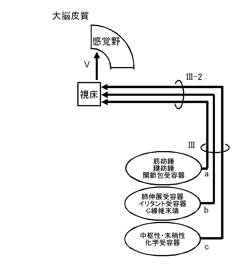 受容器からの信号の感覚:たとえば、CO2が増加すると、その受容器からの求心性活動自体が大脳皮質に届き、息苦しさを引き起こすと考えられている。図中の 図中のIII, III-2, Vの経路である。