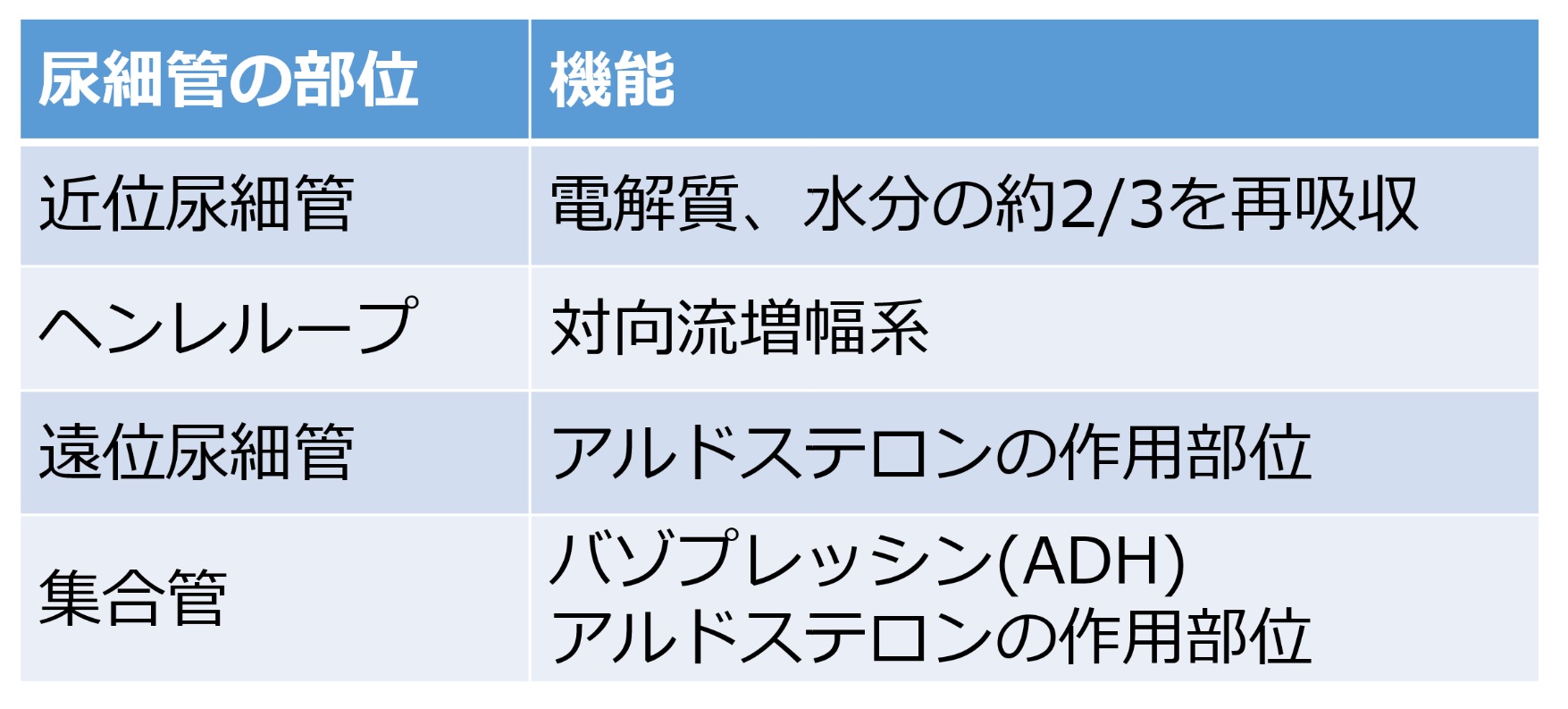 近位尿細管:ろ過された塩分、水分の約2/3を再吸収する。 ヘンレループ:尿を濃縮するために必要な対向流増幅系を構成している。 遠位尿細管:(ナトリウム再吸収のポンプがあり)アルドステロンの作用部位。 集合管:(水分を再吸収する水チャンネルがあり)バゾプレッシン、抗利尿ホルモン(ADH)の作用部位ならびに(ナトリウム再吸収のポンプがあり)アルドステロンの作用部位